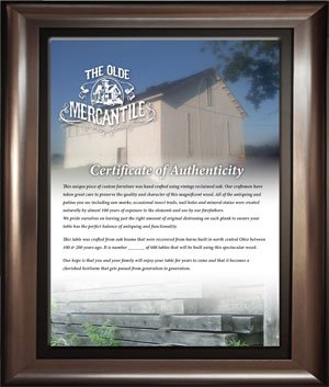 Each piece of Olde Mercantile furniture has its own unique history and comes with a Certificate of Authenticity