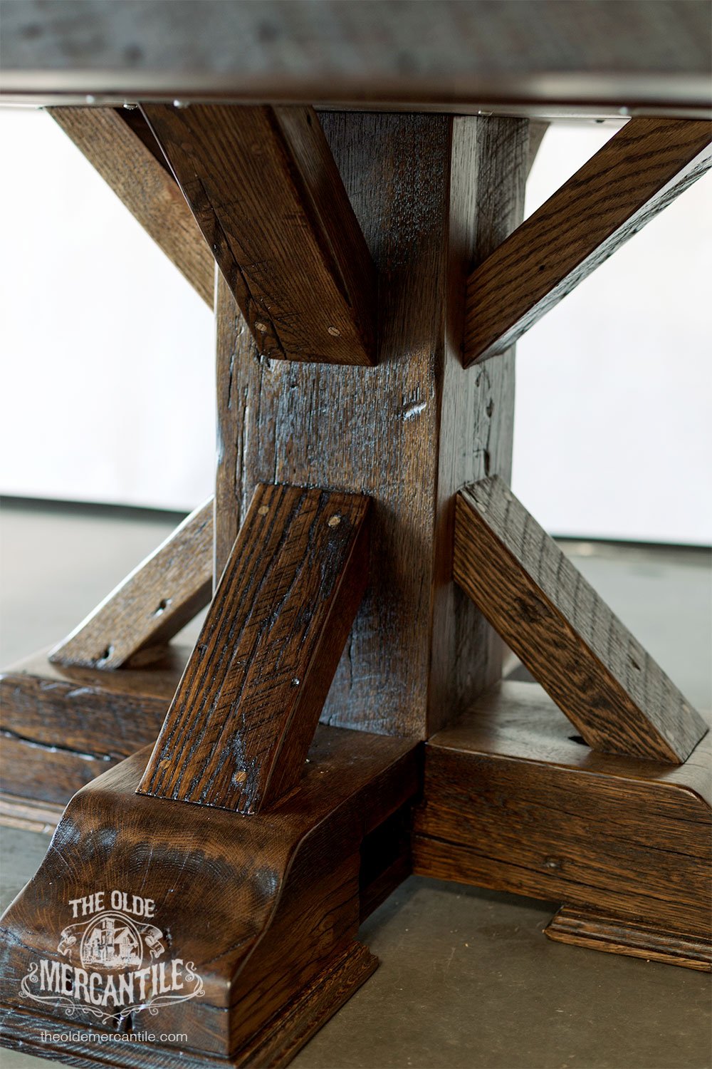Inspired by a complex rafter support system utilized in century-old structures, this sturdy, and attractive table base is made completely of vintage reclaimed support beams.