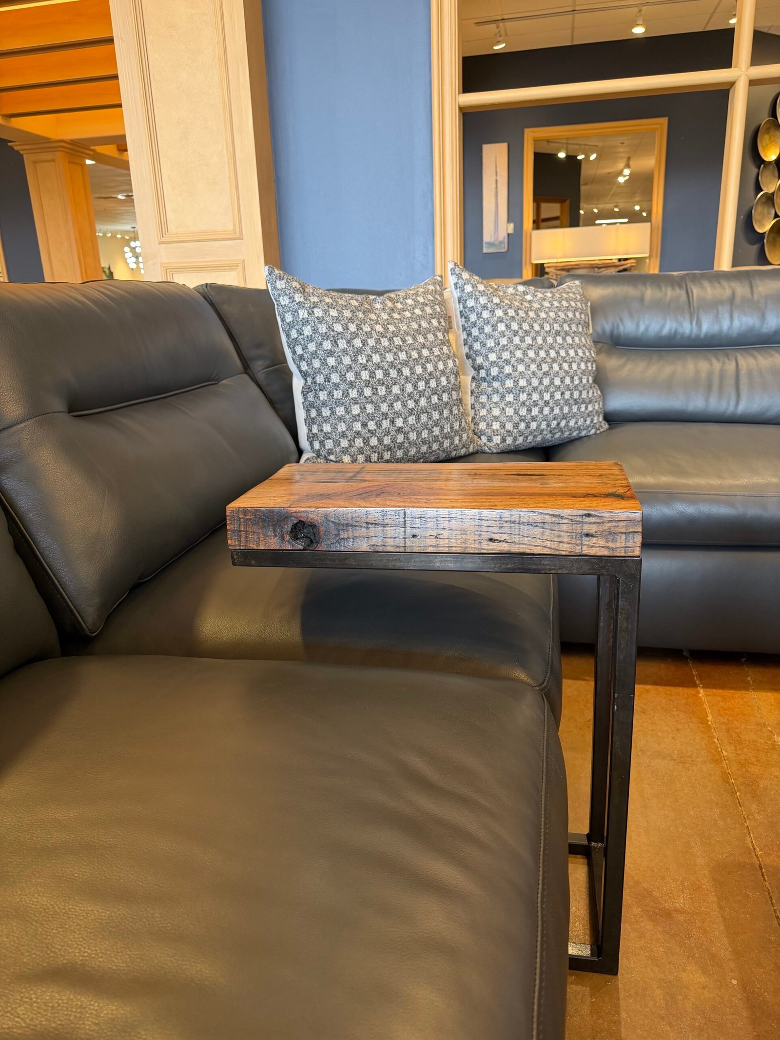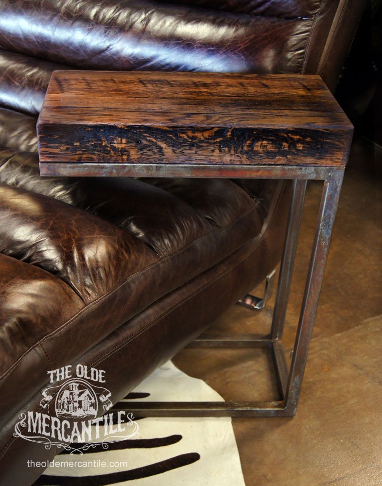 The Modern Industrial feel of this collection comes from the 1.5” etched iron base. It is combined with the vintage reclaimed 100-year-old oak top.