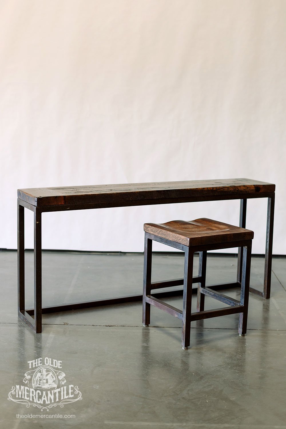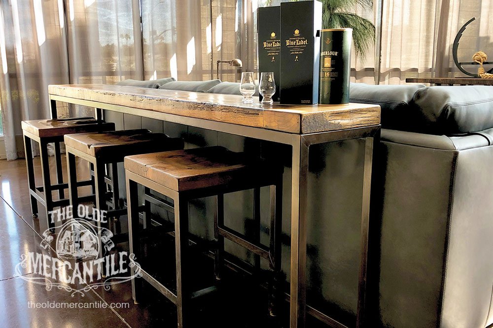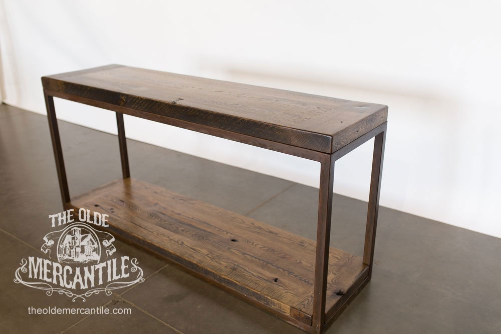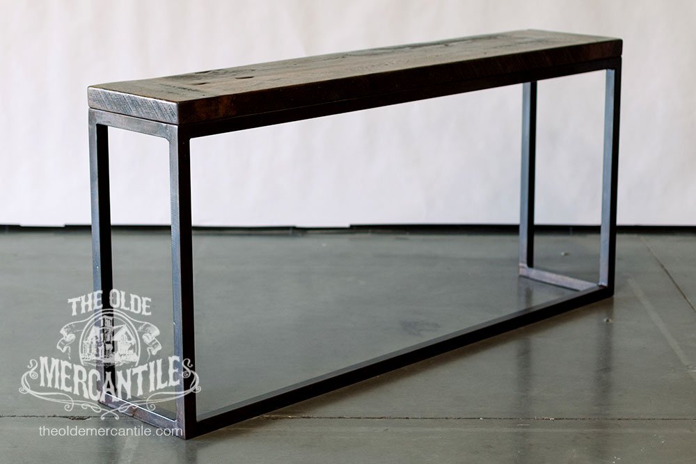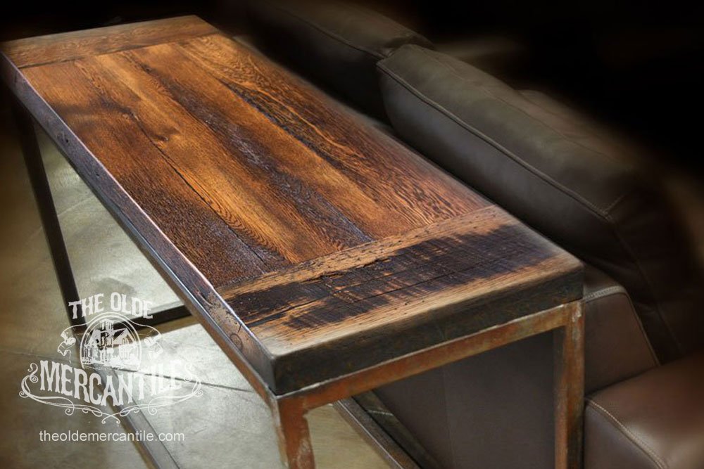 The Modern Industrial feel of this collection comes from the 1.5” etched iron base. It is combined with the vintage reclaimed 100-year-old oak top.